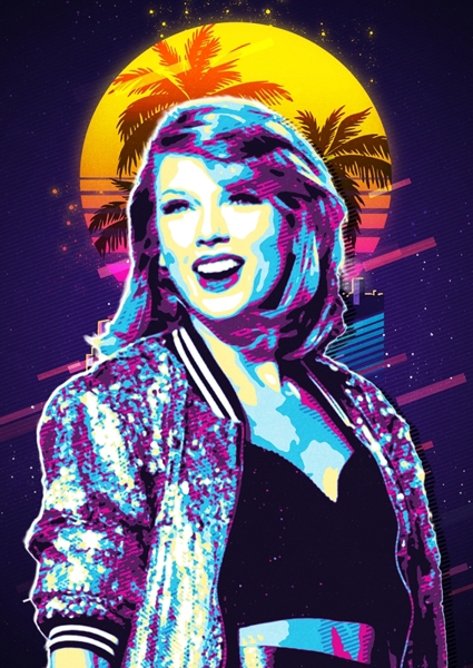 "Taylor Swift" poster by ndesign. Dive into this vibrant artwork that captures the electrifying essence of Taylor Swift. With a retro-futuristic vibe, the bold colors pop against a dreamy sunset backdrop, echoing the playful spirit of her music. The shimmering jacket and confident smile radiate charisma, inviting fans to celebrate their inner Swiftie. This piece is a perfect blend of nostalgia and modern flair, making it a must-have for any lover of pop culture. Get ready to turn heads and spark conversations!