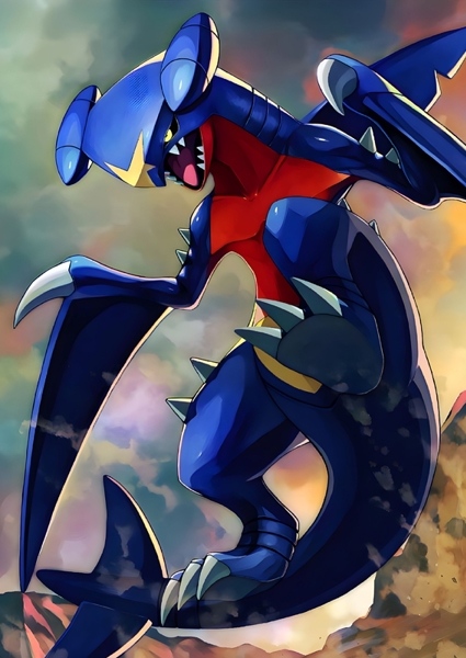 "Garchomp is a dual Dragon/Ground type Pokémon known for its tremendous speed and powerful attacks. It has a shark-like appearance with sharp claws and a distinctive fin on its head. Garchomp is an intimidating and formidable Pokémon that strikes fear into its opponents with its speed and strength."