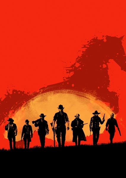 "Red Dead Redemption Silhouette" poster by Axsant. Dive into the wild west with this striking silhouette artwork. Featuring iconic characters from Red Dead Redemption, the bold red, black, and yellow color palette creates an electrifying backdrop. The figures stand tall against a vibrant sunset, evoking a sense of adventure and nostalgia. Perfect for any gaming enthusiast or cowboy aficionado, this piece transforms any space into a mancave masterpiece. Embrace the spirit of the frontier and let the adventure unfold!