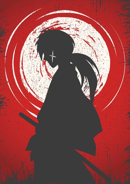 "samurai x Rurouni Kenshin" poster by Ota Studios. Dive into the world of samurai with this striking artwork featuring a silhouette against a bold red backdrop. The figure, poised with a katana, embodies the spirit of bushido – honor, courage, and discipline. The swirling patterns evoke a sense of movement, hinting at the dynamic martial arts that define this culture. Perfect for fans of Japanese art and martial arts, this piece captures the essence of a timeless warrior, making it a standout addition to any collection.