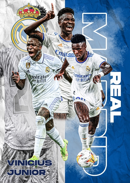 "Vini Jr." poster by HERWANA. This vibrant artwork captures the electrifying spirit of Vinícius Júnior, the Brazilian sensation lighting up the pitch for Real Madrid. With dynamic poses and a bold color palette, it showcases his agility and flair – a true testament to his talent. The backdrop, featuring the iconic Real Madrid emblem, adds a layer of prestige. Perfect for football fans and art lovers alike, this piece embodies the energy and passion of the beautiful game. A must-have for any collector!