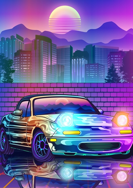 ""Mazda MX5 Miata Synthwave" I aimed to capture life's dualities. By merging the Skyline Gtr's elegance with a bustling city against tranquil mountains, I aimed to evoke an appreciation for contrasts. Synthwave's vivid colors mirror the city's vibrancy, while the mountains signify nature's timeless"