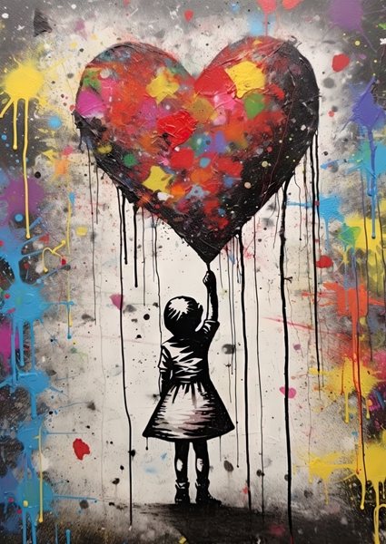 "Girl holding heart shaped balloon, warped with splashes of paint. Adapted from the style of Banksy"