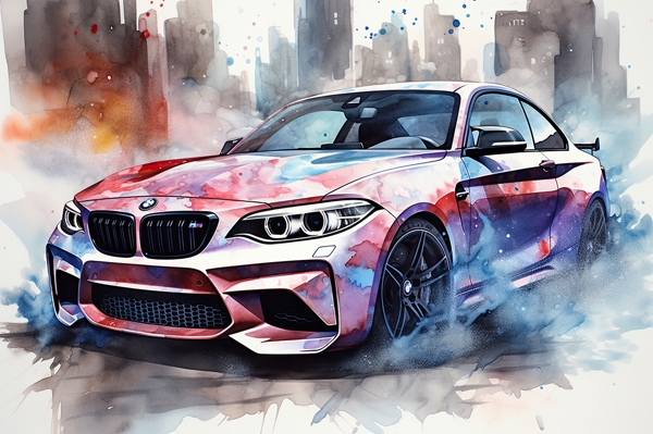 "BMW M2 Art" poster by Remigius Wloczkowski. This artwork captures the BMW M2 in a vibrant, watercolor explosion. The Coupé Sport version stands out with its sleek lines and aggressive stance, set against an urban backdrop. Splashes of color dance around the car, creating a dynamic feel that mirrors the thrill of the race. It’s not just a car; it’s a statement. Perfect for those who appreciate speed and style, this piece brings a modern edge to any space.
