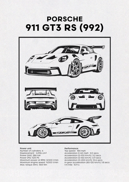 "Porsche GT3 RS " poster by Morten Conrad. This artwork captures the essence of the Porsche 911 GT3 RS (992) in a sleek, minimalist style. Featuring striking illustrations from multiple angles, it showcases the car's aggressive lines and iconic design. Performance stats at the bottom add a layer of intrigue—think speed, power, and that unmistakable racing pedigree. Perfect for car enthusiasts and art lovers alike, this piece is a celebration of automotive excellence. Get ready to rev up your space with this stunning tribute to a legendary machine.