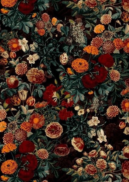 "EXOTIC GARDEN - NIGHT XXI" poster by Burcu Korkmazyurek. Dive into a lush, botanical wonderland with this vibrant artwork. A tapestry of exotic flowers bursts forth against a deep, dark backdrop, creating a striking contrast that pulls you in. Each bloom – from bold roses to delicate lilies – tells a story of a tropical night garden, rich with life and color. It’s vintage yet fresh, a retro vibe that feels right at home in any modern space. Perfect for those who crave a touch of nature’s wild beauty.