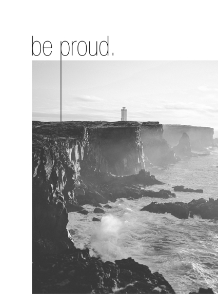 "Text Art – be proud. " poster by Linda Rosenau. A striking black-and-white scene that screams confidence. The rugged cliffs meet the relentless ocean, while a lighthouse stands tall, a beacon of pride. The bold text “be proud” cuts through the image, urging a moment of self-reflection. It’s not just art; it’s a vibe. Perfect for those who appreciate motivation wrapped in raw nature. This piece is a reminder to embrace strength and stand tall against the waves of life.