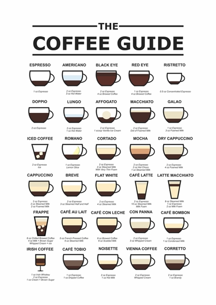 "the coffee guide" poster by Ratna Mutia Dewi. Dive into the world of coffee with this minimalist wall art print – a vibrant guide to coffee variants. Each cup is a little masterpiece, showcasing everything from the bold espresso to the creamy latte macchiato. Perfect for coffee lovers and shop vibes, this print adds a playful touch to any space. It's not just art; it's a conversation starter. Elevate your coffee game and let your walls brew inspiration!