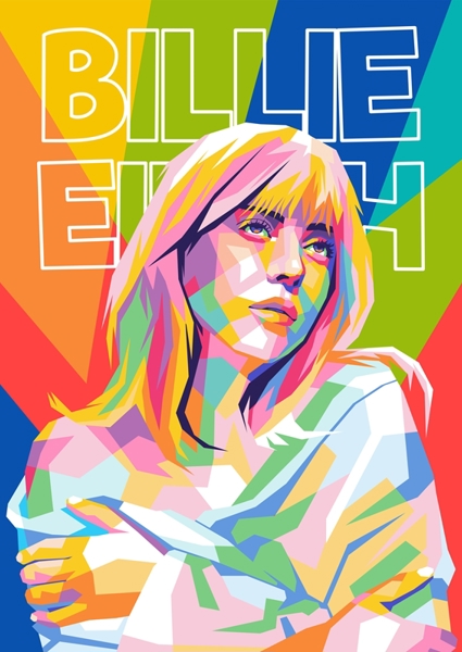 "billie eilish" poster by Reng Guwe. This vibrant artwork captures the essence of Billie Eilish in a striking WPAP pop art style. Bold colors collide and create a dynamic backdrop that mirrors her unique persona. The geometric shapes and playful hues reflect her artistic flair and individuality. With a confident gaze, she embodies the spirit of modern music, making this piece a must-have for fans. Perfect for adding a splash of contemporary culture to any space.