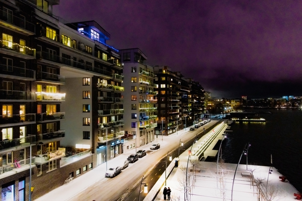 "Hornsbergs Strand during a winter evening. Here we see many beautiful lights that appear in the winter darkness."