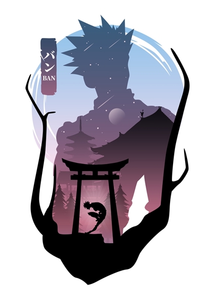 "Ban the seven deadly sins" poster by skiefe. Dive into the world of "Ban the Seven Deadly Sins" with this striking anime illustration. Featuring a silhouette of Ban, the artwork captures a mystical landscape filled with serene trees and a traditional torii gate. The gradient sky transitions from soft blues to deep purples, evoking a sense of calm and intrigue. It’s like a snapshot of a moment where fantasy meets tranquility – perfect for any anime lover looking to add a touch of magic to their space.