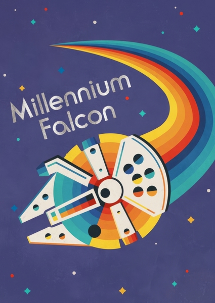 "Millennium Falcon" poster by fineartus. Blast off into a galaxy of nostalgia with this vibrant artwork featuring the iconic Millennium Falcon. The sleek ship zooms through a cosmic swirl of colors, capturing the essence of adventure and rebellion. With playful retro vibes and a bold design, it’s a must-have for any Star Wars fan. Perfect for adding a pop of interstellar charm to your space, this piece celebrates the legendary journey of Han Solo and Chewbacca. Get ready to make the jump to lightspeed!