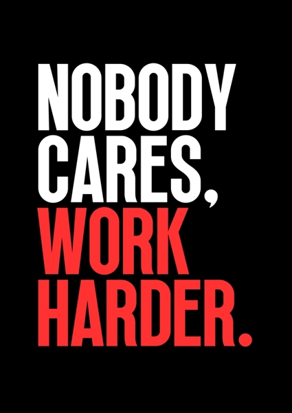 "Nobody Cares Work Harder" poster by MUHAMMAD ARIFIN. Transform any space with this bold statement piece – 'Nobody Cares, Work Harder' is more than just words; it’s a call to action. The striking contrast of white and red against a black backdrop grabs attention and sparks motivation. Perfect for those who thrive on hustle and grit, this artwork serves as a daily reminder to push boundaries and chase dreams. Elevate your environment and embrace the grind with this unapologetic mantra.