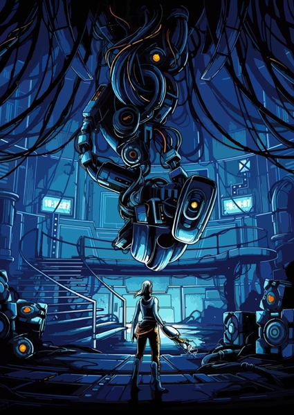 "Portal 2" poster by Proven Art. Step into a world where gaming meets art – this illustration captures the essence of adventure and puzzle-solving. A mysterious figure stands before an imposing robotic entity, surrounded by a labyrinth of cables and glowing lights. The deep blues and striking contrasts create a retro-futuristic vibe, perfect for any gaming enthusiast. It’s not just a poster; it’s an invitation to explore the mind-bending universe of Portal. Ideal for adding a touch of fantasy to any wall.