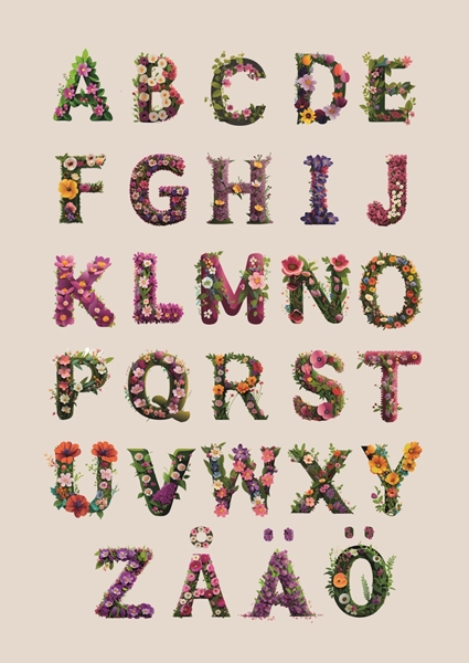 "Flower alphabet" poster by Paperago. Dive into a floral wonderland with this vibrant artwork featuring the Swedish alphabet, each letter adorned with a riot of flowers in every imaginable shape and color. From tulips to roses, it’s a botanical explosion that transforms the ABCs into a playful garden party. Perfect for adding a splash of color and whimsy to any space, this piece is a celebration of nature's beauty and creativity. Bring home a piece that’s as lively as it is unique!