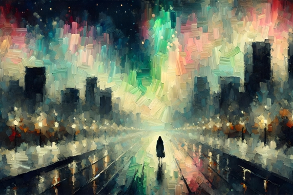 "Pointless" poster by Dennis Joel. A lone woman stands amidst an abstract cityscape, where towering skyscrapers loom under a vibrant night sky. The colors pop—deep blacks, vivid pinks, and lush greens swirl together, reminiscent of the northern lights. Reflections dance on the wet pavement, creating a dreamlike atmosphere. It’s a moment of solitude and contemplation, capturing the essence of late-night wanderings and life’s big questions. Perfect for those who appreciate the blend of urban life and abstract expression.