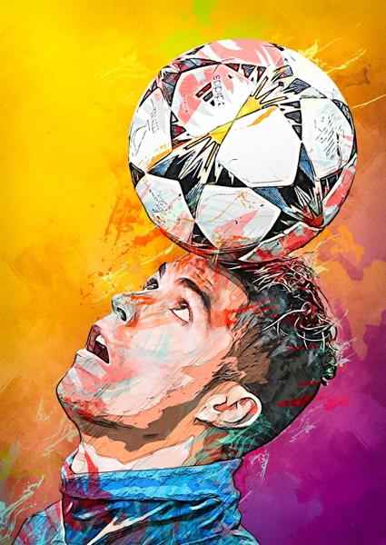 "Ronaldo Painting" poster by crystal maxwell. This vibrant artwork captures the essence of a football legend in action. A striking portrait of a player, eyes wide with focus, balances a soccer ball effortlessly on his head. The background bursts with dynamic colors – yellows, purples, and reds – creating an energetic vibe that mirrors the thrill of the game. It's a celebration of skill and passion, perfect for any sports enthusiast or art lover looking to add a touch of excitement to their space.