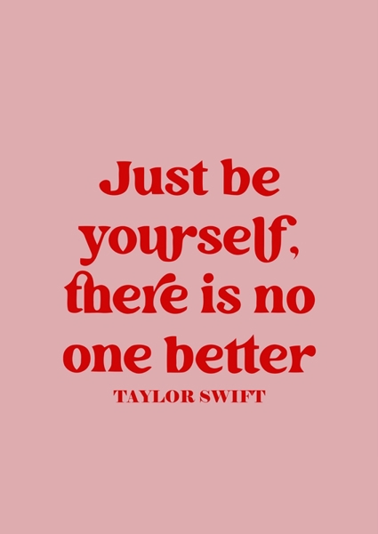 "Taylor Swift Lyrics" poster by Lory Pentolo. This vibrant poster captures a powerful message straight from the heart of Taylor Swift – "Just be yourself, there is no one better." The bold typography pops against a soft pink backdrop, making it a striking addition to any space. Perfect for Swifties or anyone needing a daily dose of self-love and authenticity, this artwork serves as a reminder that individuality is key. Hang it up and let those words inspire confidence and creativity every day.