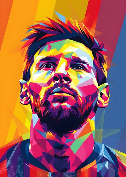 "Messi Football Wpap" poster by peter sonclaire. Dive into the vibrant world of Messi with this electrifying artwork. Bursting with bold colors and geometric shapes, it captures the essence of the football legend in a way that’s anything but ordinary. The intense gaze and dynamic hues evoke a sense of passion and determination, making it a must-have for any sports enthusiast. Perfect for adding a splash of energy to any space, this piece is a celebration of creativity and the beautiful game.