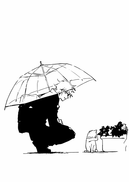 "Gojo Satoru was squatting with an umbrella while looking at the cat next to the flower vase who was licking his feet"