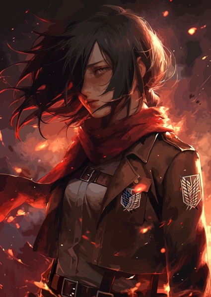 "Mikasa Ackerman " poster by Eko. This artwork captures the fierce spirit of Mikasa Ackerman from Attack on Titan. With her intense gaze and flowing hair, she stands strong against a backdrop of fiery chaos. The vibrant colors and dynamic lighting create a dramatic atmosphere, highlighting her determination and resilience. The iconic Survey Corps jacket and striking red scarf add a touch of boldness, making this piece a must-have for any anime fan. Embrace the power and passion of this unforgettable character.