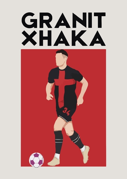 "Granit Xhaka 34" poster by Razid Golokor. Celebrate the spirit of football with this striking artwork featuring Granit Xhaka. The bold design showcases him in action, draped in a dynamic black kit with a striking red cross – a nod to his impactful presence on the pitch. The minimalist style and vibrant colors capture the essence of dedication and triumph, echoing Bayer Leverkusen's league legacy. Perfect for any football fan, this piece is a must-have for those who appreciate the beautiful game.