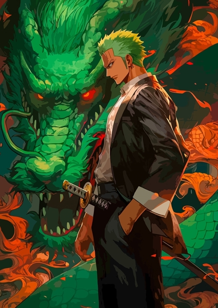 "One Piece Zoro" poster by Blossom 01. Dive into this electrifying vector art featuring One Piece Zoro, striking a bold pose beside a massive dragon. The vibrant colors pop, with Zoro’s fierce expression and iconic sword ready for action. The swirling flames and intricate dragon details create a dynamic backdrop, blending fantasy and adventure seamlessly. Perfect for anime lovers and anyone craving a touch of epic storytelling in their space. This artwork is a must-have for those who appreciate the thrill of the chase and the heart of a hero.