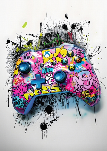"Xbox controller " poster by mber schmalz. Dive into the vibrant world of gaming with this electrifying Xbox controller artwork. Bursting with colorful graffiti and street art vibes, it’s a playful tribute to the gaming culture. The bold splashes and intricate designs scream creativity, making it a perfect gift for any gamer. This piece doesn’t just sit on the wall – it sparks conversations and ignites imaginations. Level up your space with this captivating masterpiece that’s all about fearless expression and boundless fun.