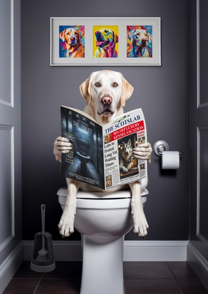 "White Labrador on the Toilet" poster by Craig Doogan. A White Labrador takes a seat on the toilet, casually flipping through The Scotslab newspaper. This quirky digital artwork blends humor and charm, perfect for any pet lover's space. The playful scene, enhanced with vibrant colors and clever details, captures a moment of canine curiosity and relaxation. Ideal for adding a dash of whimsy to bathrooms or as a unique gift for Labrador enthusiasts. Who knew bathroom breaks could be this entertaining?