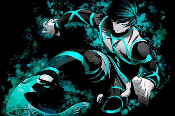 "Blue Lock anime" poster by Klemens 08. Dive into the electrifying world of football with this stunning artwork featuring a dynamic anime player in a sledding tackle pose. The vibrant blue and black color scheme pops against a swirling backdrop, capturing the intensity of the game. With striking green eyes and a fierce expression, this piece embodies action and energy. Perfect for fans of sport and anime alike, it’s a must-have for anyone looking to elevate their space with a touch of modern pop art flair.