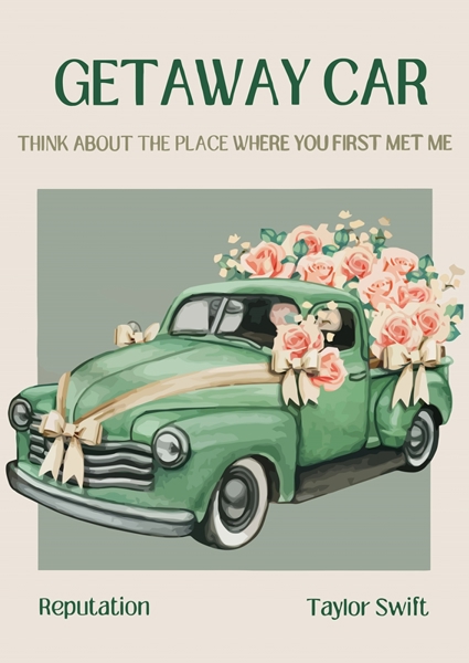 "Taylor Swift Getaway Car" poster by Reka Boloham. This artwork captures the whimsical spirit of a classic getaway car, adorned with lush roses and a playful vibe. It’s like a snapshot of romance, echoing Taylor Swift’s lyrical magic. The pastel green hue invites nostalgia, while the floral embellishments add a dreamy touch. Perfect for fans who cherish those intimate moments and poetic memories. It’s not just art; it’s an invitation to relive the magic of first meetings and unforgettable nights.