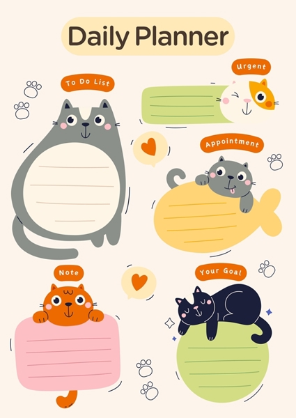 "DAILY PLANNER SUTTON FOSTER" poster by Wm B. Douglas. This daily planner is a delightful blend of whimsy and functionality. Featuring adorable cartoon cats in playful poses, it transforms organization into a fun experience. Each section—To Do List, Urgent, Appointment, Note, and Your Goal—invites creativity with vibrant colors and charming illustrations. The cat characters add a lighthearted touch, making planning feel less like a chore and more like a joyful activity. Perfect for cat lovers and anyone looking to add a sprinkle of joy to their daily routine!