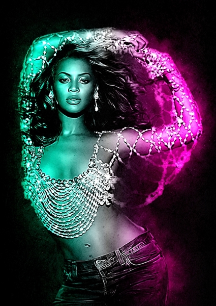 "Beyonce" poster by ByTvv. This vibrant portrait captures the essence of Beyoncé in a striking blend of colors and energy. The dynamic pose and intricate detailing of her outfit create a sense of movement, while the neon hues of green and pink add a modern twist. It’s not just a painting; it’s a celebration of music, dance, and artistry. Perfect for anyone looking to bring a touch of pop culture into their space, this artwork radiates passion and creativity.