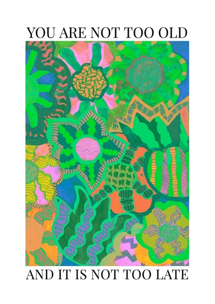 "You are not too old" poster by Jessica Pleur. Bold colors collide in this vibrant artwork, bursting with life and energy. The playful mix of greens and pinks creates a lush backdrop, while the motivational quote stands out, reminding everyone that age is just a number. It’s a visual pep talk – a celebration of growth and possibility. Perfect for anyone needing a little nudge to embrace their journey. This piece is not just art; it’s a statement. Bring it home and let the inspiration flow!