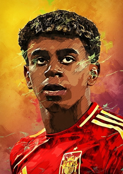 "Lamine Yamal" poster by Malin Art. This vibrant artwork captures the essence of Lamine Yamal, a rising star in the soccer world. The bold colors and dynamic brush strokes create an electrifying backdrop, reflecting the energy of the sport. The detailed portrait showcases Yamal's intense gaze, embodying determination and passion. Perfect for any sports enthusiast, this piece adds a splash of excitement to any space. Available as a poster or framed fine art print, it’s a must-have for your personal art collection!