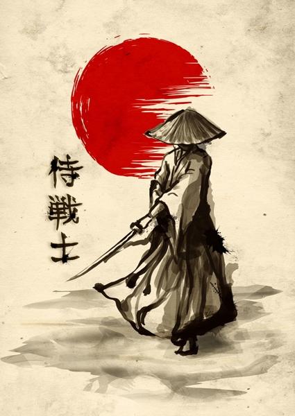 "Samurai red moon, Japanese art sumi e poster art, Asian art home decor"