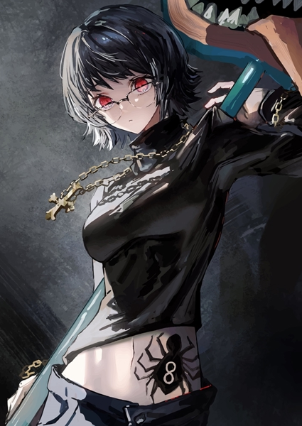 "Shizuku Murasaki" poster by Demiourgos. Meet Shizuku Murasaki – a blend of casual and killer vibes. With her short black hair and glasses, she’s the girl next door, but don’t be fooled. That simple black top and those black pants hide some serious skills. The spider tattoo? Just a hint of the danger lurking beneath her unassuming exterior. This artwork captures a retro, anime-inspired essence that’s both nostalgic and fresh. Perfect for anyone who loves a touch of fantasy with a side of mystery.