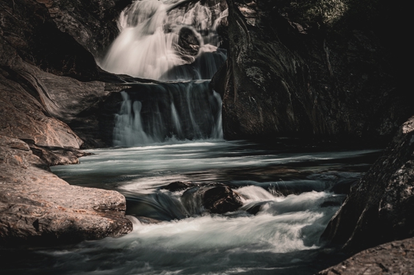"Whispers of the Waterfall" poster by Johan Karlsson. A mesmerizing cascade tumbles down rugged cliffs, where water dances and swirls in a tranquil turquoise pool. The interplay of light and shadow creates a moody atmosphere, inviting a sense of calm and introspection. Moss-covered rocks frame this hidden gem, embodying nature's raw beauty. It's a serene escape, perfect for those seeking a moment of peace amidst the wilderness. Dive into this tranquil scene and let the whispers of the waterfall wash over you.