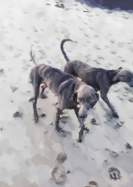 "Strandhundar/Beach dogs" poster by Dorothea Schander. Two playful pups roam the sandy shores, their tails wagging like they just found the meaning of life. Captured in a moment of pure joy, these beach dogs embody the carefree spirit of Costa Rica. The soft, muted colors blend seamlessly with the sandy backdrop, creating a dreamy vibe. It's all about those cuddles and sandy paws – a reminder that happiness is often found in the simplest moments. Perfect for any dog lover or beach enthusiast!