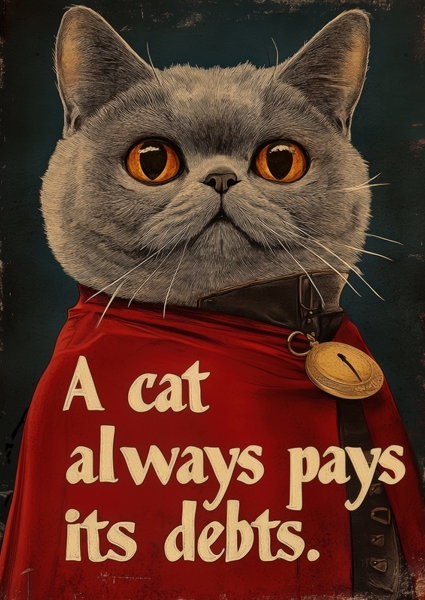 "This playful artwork features a regal cat adorned in a medieval-style cloak with the bold text 'A cat always pays its debts.' This piece is a whimsical nod to the iconic phrase from Game of Thrones. It adds a touch of fantasy and humor to any space, delighting fans of both cats and epic tales."