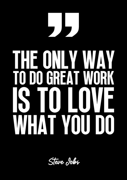 "Steve Jobs Quotes" poster by Ahmad Arifin. Bold and striking, this artwork captures a powerful quote from Steve Jobs – a reminder that passion fuels greatness. The stark black background makes the white text pop, creating an eye-catching statement piece. Perfect for any workspace or creative nook, it inspires motivation and positivity. It’s not just decor; it’s a daily nudge to dream big and keep pushing limits. Elevate your space with this piece that speaks to the heart of ambition and success.