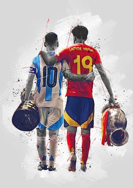 "Messi and yamal" poster by Hung Anh. This artwork captures a striking moment between two football icons, Messi and Yamal, walking side by side, each draped in their national colors. The vintage style adds a nostalgic vibe, while the bold strokes and splashes of color evoke a sense of passion and unity in sport. It’s a celebration of talent and camaraderie, blending the essence of football with a modern artistic twist. Perfect for any sports enthusiast looking to elevate their space with a piece that tells a story.