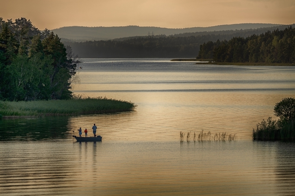 "Family fishing at sunset on lake Harefjorden in southern Värmland."