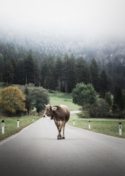 "Alone in the wide open spaces" poster by Michael Mandsfeld . A curious Allgäu cow strolls down a lonely country road, embodying that perfect blend of serenity and solitude. Surrounded by a misty mountain landscape and dense forest, this scene captures a peaceful yet slightly whimsical vibe. The fog adds a dreamy touch, making it feel like a moment frozen in time. Ideal for those who appreciate nature's quiet beauty, this artwork invites viewers to embrace the calm of the Alps and the charm of rural life. Perfect for home decoration!