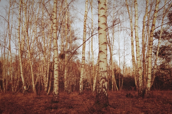 "this is an art photography of a birches forest in Dresden with a calm and melancholic mood but strong expression. the trees build the connection between earth and sky. I chose sepia magenta and light blue tones instead of black and white to emphasize the mood and make it look a bit fresher."