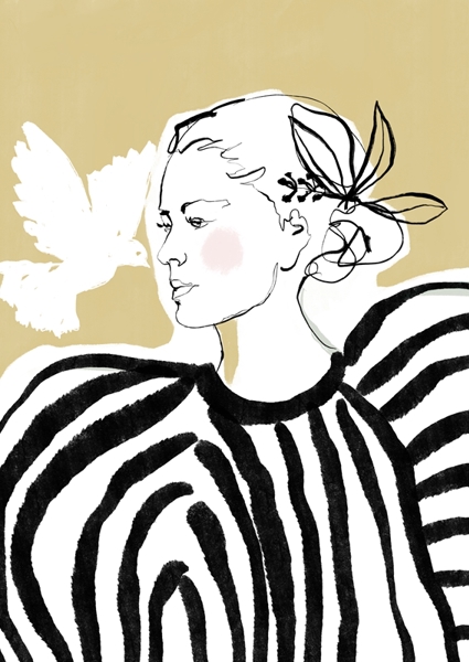 "The artwork features a woman in a striped outfit standing gracefully against a soft, tranquil background. Beside her, a white dove soars, embodying the timeless symbol of peace and harmony"