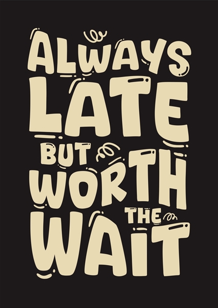 "Special lettering text that says "Always Late But Worth The Wait" in very elegant colors with a dark background. "