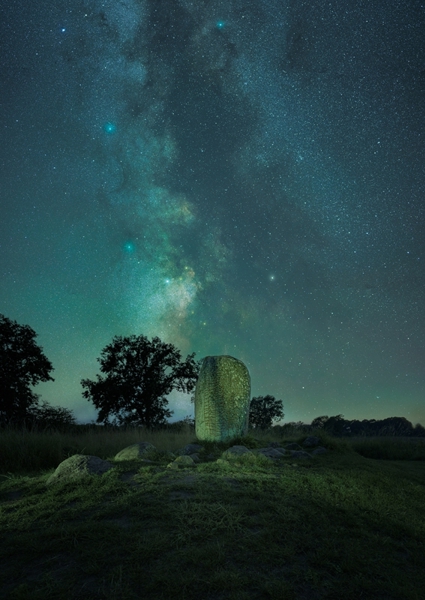 "Karlevi rune stone" poster by Marcus Bengtsson. A stunning glimpse of the Karlevi rune stone, standing tall under a mesmerizing Milky Way. Captured on a dark September night, this artwork invites viewers to connect with ancient Viking history while gazing at the stars. The stone, adorned with mysterious runes, seems to whisper tales of the past, surrounded by the serene Öland landscape. Perfect for those who appreciate the blend of history and cosmic wonder – a true conversation starter for any space lover.