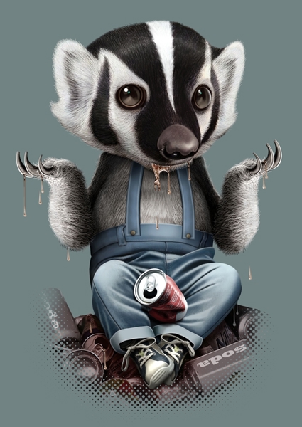 "Playful Badger Charm" poster by Adam Lawless. This artwork captures a whimsical badger, decked out in denim overalls, lounging atop a chaotic pile of crumpled soda cans. With oversized, expressive eyes and a playful demeanor, this anthropomorphic character radiates charm and curiosity. The blend of surrealism and pop culture vibes makes it a standout piece for eclectic interiors. Perfect for sparking conversations in living rooms or creative spaces, it’s a delightful nod to modern art that invites joy and a touch of fantasy into any setting.