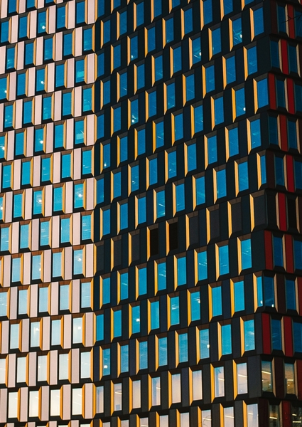 "This artwork captures the rhythm of the modern city through a mesmerizing façade where light and shadow dance across glass and steel. Inspired by the warm evening glow and the building’s dynamic patterns, it creates an illusion of movement and depth. A tribute to architectural aesthetics and the eve"